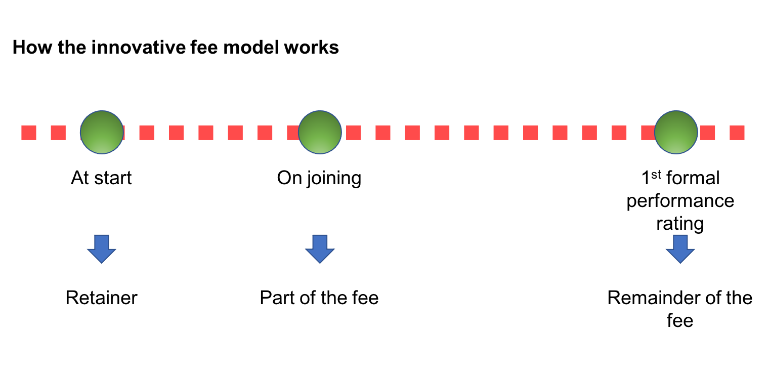 We offer a material part of our fee and stake it against the first performance evaluation rating of the candidate. Depending upon the rating, we either get an upside on the fee or just the balance part of the fee. With this model, as a client, you see the value and then pay. As a search partner, we deliver and then collect.