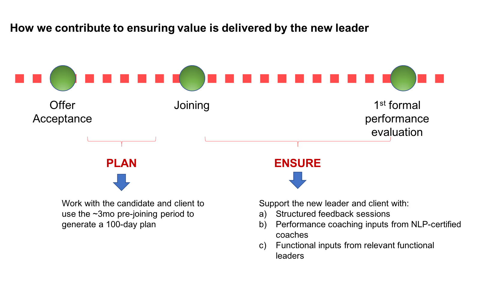 Hiring is a success when the new leader delivers on the business results for which he/she has been hired. We work towards this over 6-12 months period after the candidate accepts the offer: